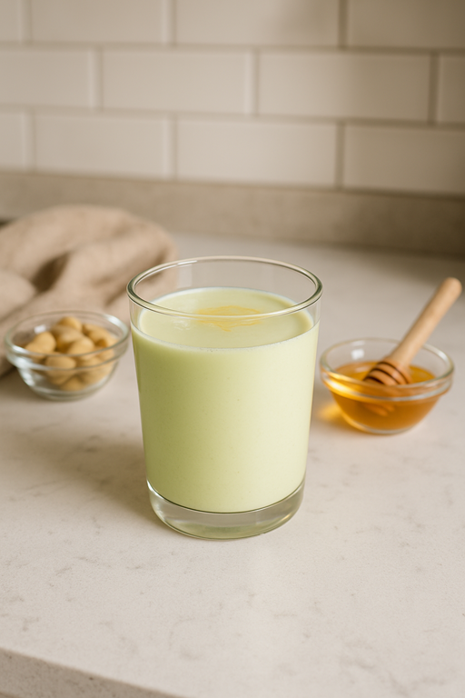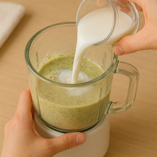 牛乳200mlを加え、1分ほどミキサーを回します。全体がなめらかに混ざり、ほんのり淡いグリーン色のピスタチオミルクが完成します。 - 仕上げに甘みをプラス