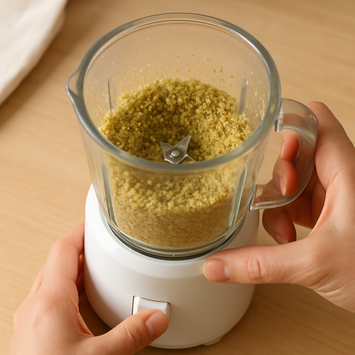 ピスタチオをミキサーに入れ、まずは「ナッツが粉状になるくらい」まで数秒ずつ回します。完全にペーストにしなくても大丈夫ですが、粒が大きすぎると口当たりがざらつくので、しっかり細かくするのがポイントです。 - 水を加えてなめらかにする