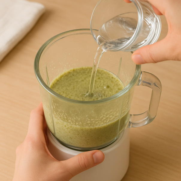 水100mlを注ぎ、さらに30〜40秒ほどミキサーを回します。ピスタチオの粉が水分を吸って、とろみのある“ピスタチオペースト状”になります。 - 牛乳(または豆乳)を加える
