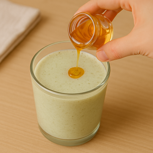 グラスに注ぎ、お好みではちみつを小さじ1加えてよく混ぜます。メープルシロップやアガベシロップでも代用可能です。