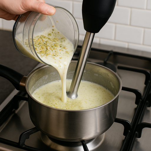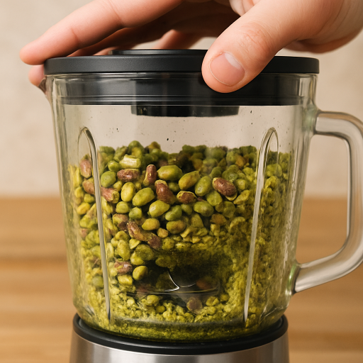 砕いたピスタチオを鍋に加え、ミキサーでなめらかになるまで撹拌。