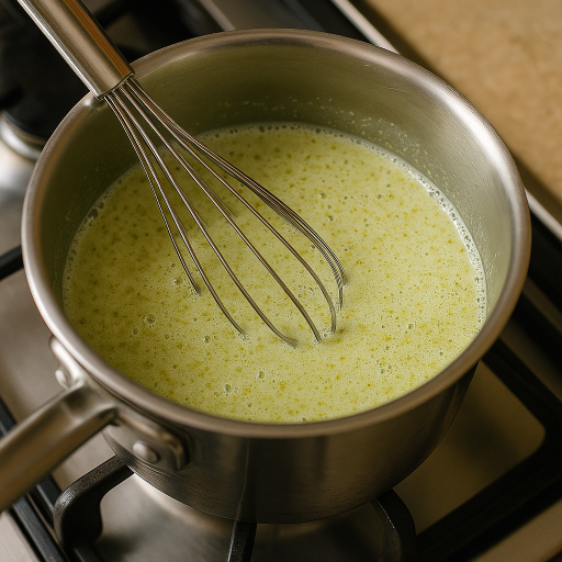 別のボウルに卵と砂糖を入れ、泡立てすぎないように混ぜる。そこへ②のピスタチオ牛乳を少しずつ加えて混ぜる。