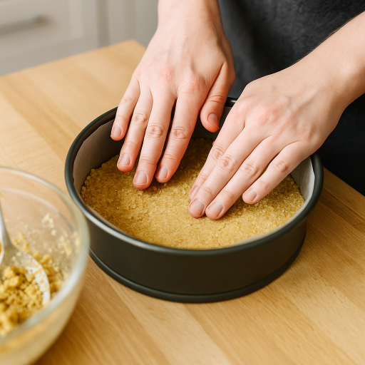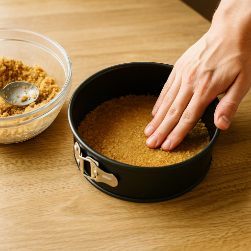 - ビスケットを砕き、溶かしバターと混ぜて型に敷き詰め、冷蔵庫で冷やす。