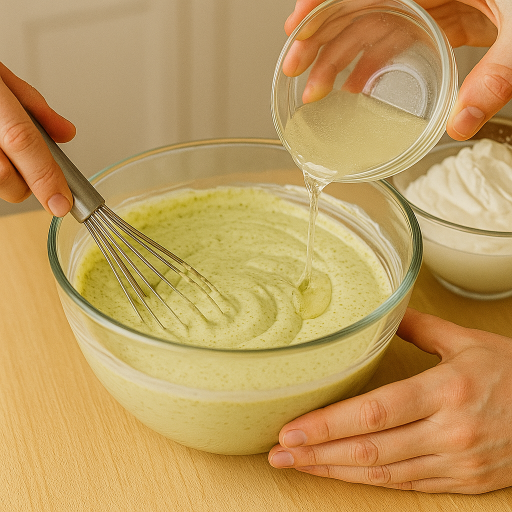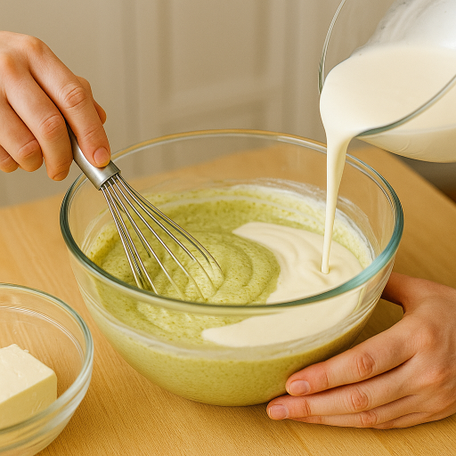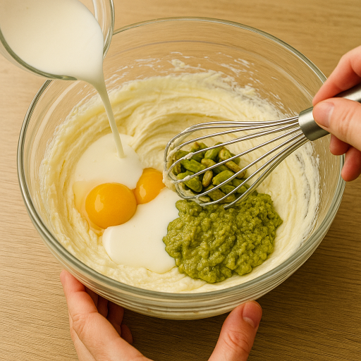 - 生クリームとピスタチオペーストを加えて混ぜ合わせる。