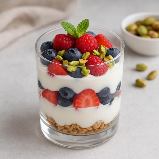 透明グラスに、グラノーラ→ヨーグルト→ベリー→ヨーグルトの順で重ねる。層が見えるようにすると映える。 - ピスタチオをトッピング