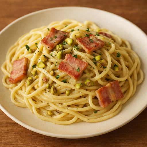 ピスタチオの香ばしさとベーコンの塩気が絶妙に絡み合い、クリームソースのまろやかさが全体を包み込みます。